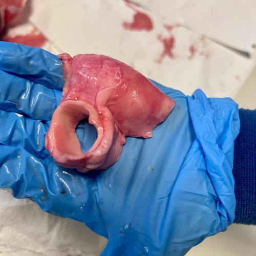 Beide Organe wurden zunächst von außen betrachtet. Anschließend wurde das Herz längs aufgeschnitten, um die beiden Herzhälften freizulegen. Beim Aufschneiden wurden die Herzkammern, Herzklappen, Papillarmuskeln und Sehnenfäden sichtbar. Das Teilen des Auges gestaltete sich zuerst etwas schwierig. Durch gute Zusammenarbeit gelang es aber und die Kinder konnten Linse, Glaskörper und Iris sehr gut erkennen.