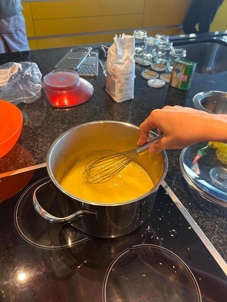 The goal was to make lemon curd, a traditional British/Irish spread. Lemon curd is a smooth, creamy mixture made from fresh lemons, sugar, butter, and eggs (which we left out). It has a bright yellow colour and a delicious balance of sweet and sour flavours. In the UK and Ireland, lemon curd is often enjoyed on toast, scones, or as a filling for cakes and desserts.